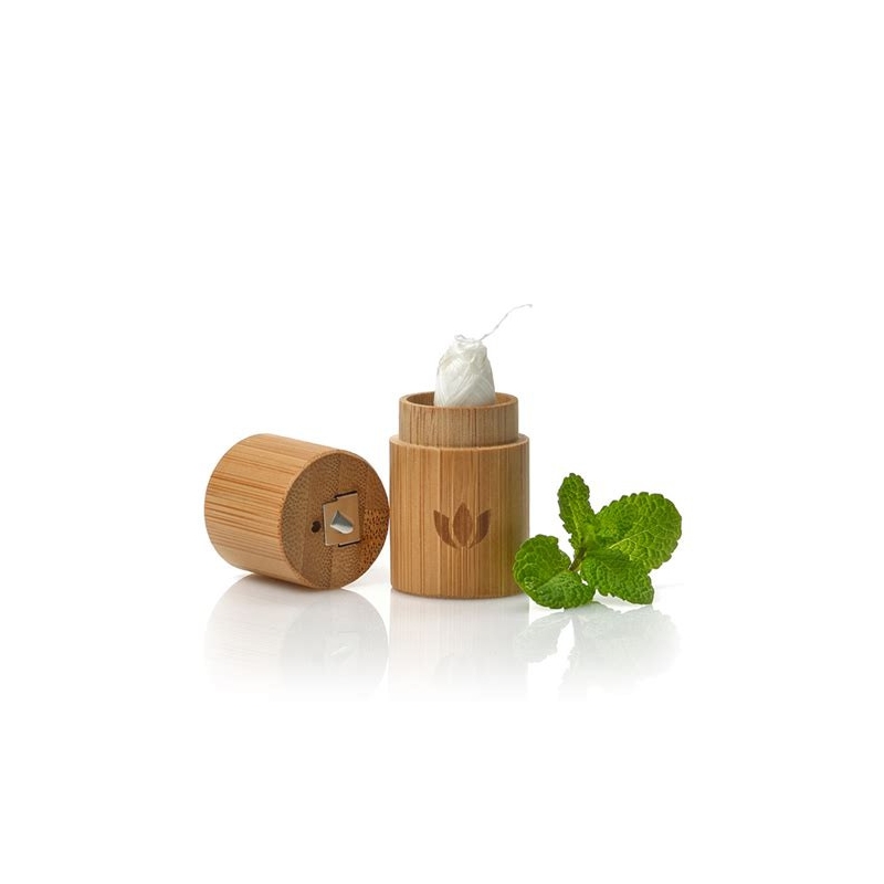 O fio dental vem com uma caixa de bambu ecológica e biodegradável proveniente das florestas de Ningbo.